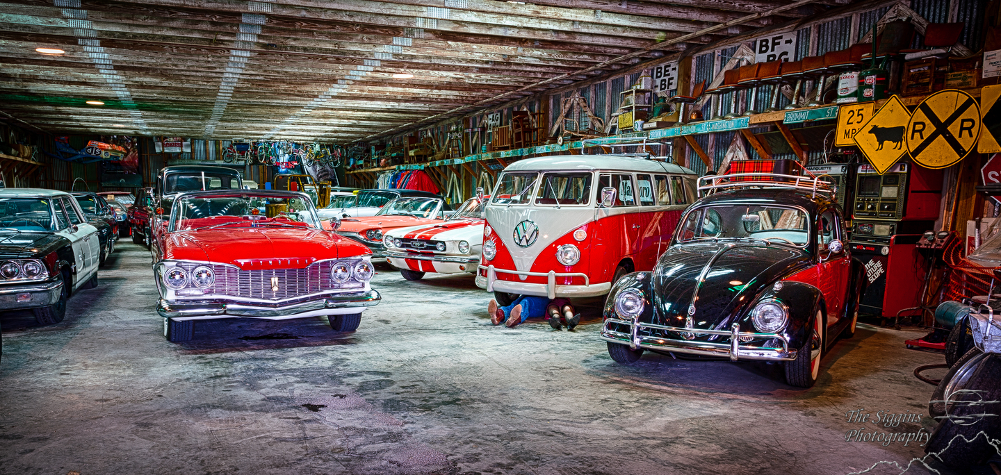 Wilbur the flying pig and a garage full of special cars, trucks, vans and one suspect couple under the VW bus.